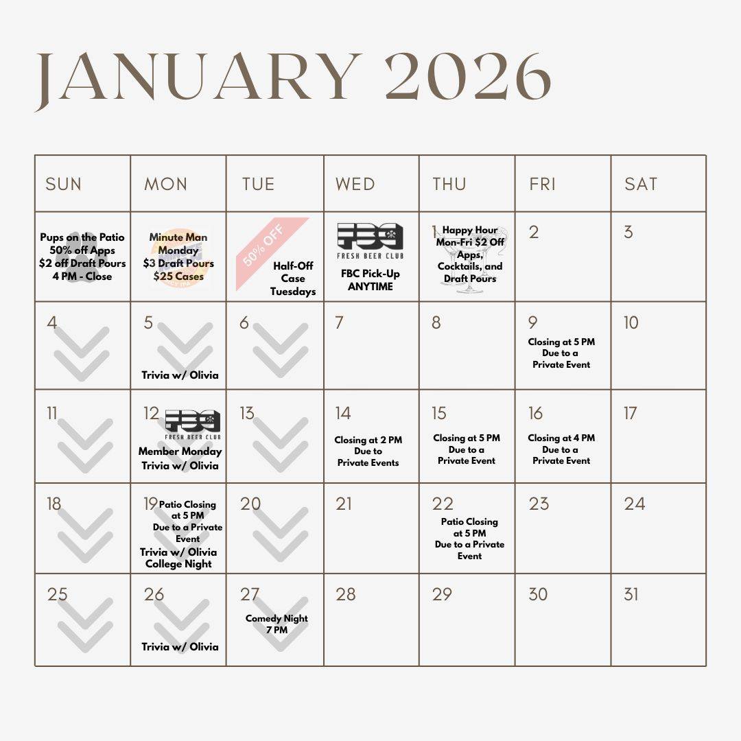 *Well-behaved, leashed animals are welcome outside on our patio (heated and covered in the Winter!). We will do our best to post on Facebook about any patio closures.