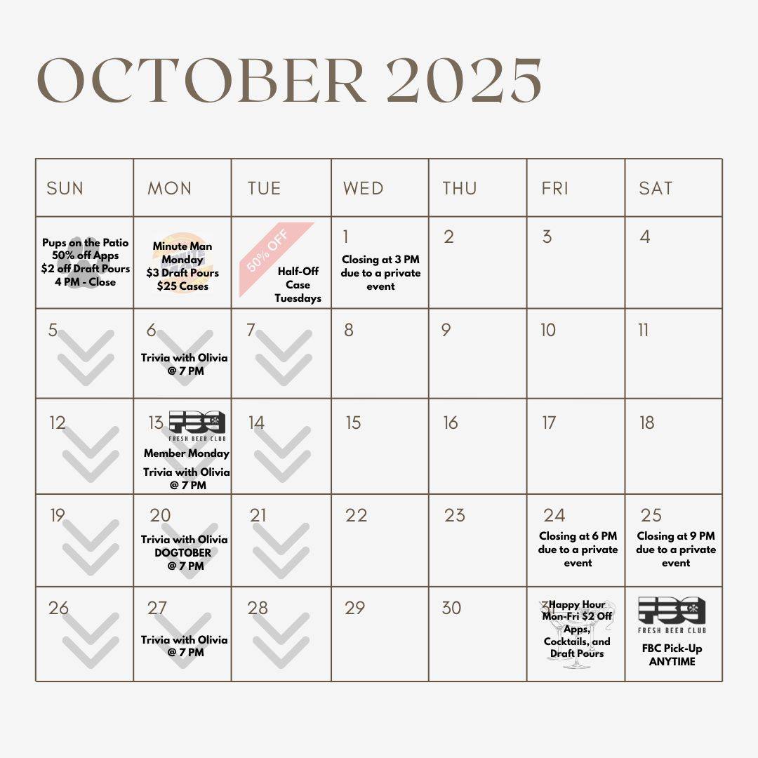 *Well-behaved, leashed animals are welcome outside on our patio (heated and covered in the Winter!). We will do our best to post on Facebook about any patio closures.