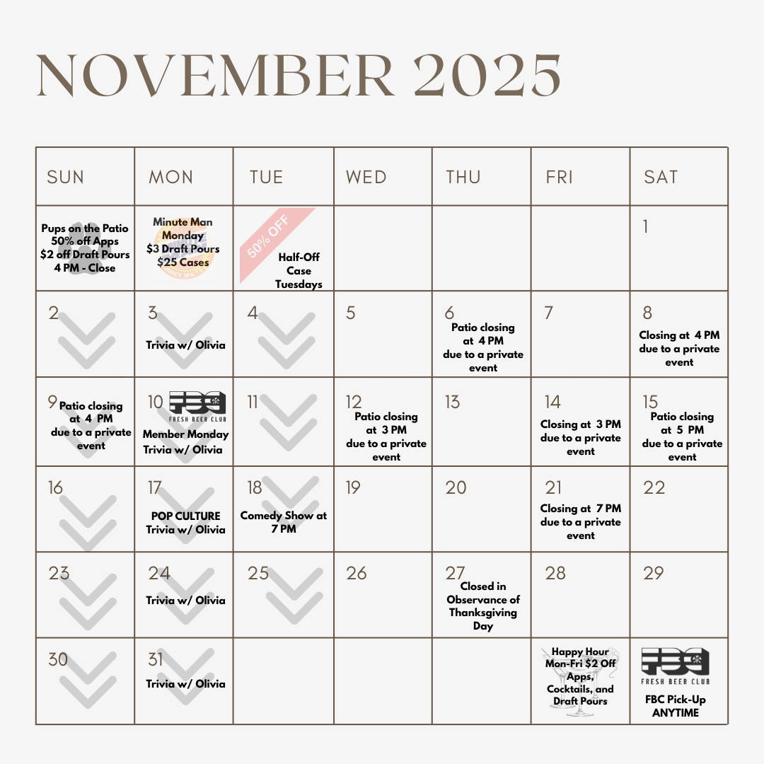 *Well-behaved, leashed animals are welcome outside on our patio (heated and covered in the Winter!). We will do our best to post on Facebook about any patio closures.