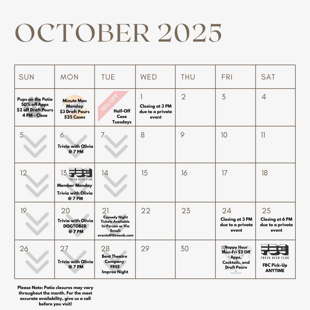 *Well-behaved, leashed animals are welcome outside on our patio (heated and covered in the Winter!). We will do our best to post on Facebook about any patio closures.